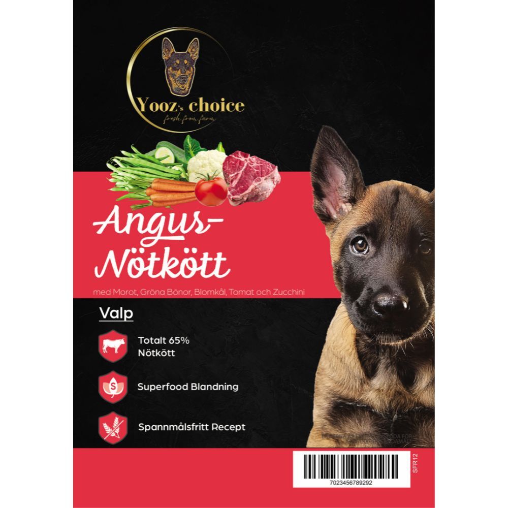 65% nötkött (35% Färsk förberedd angus nötkött, 25% torkat nötkött, 5% nötköttsfett), sötpotatis, bönor, betmassa, torkad superfoodblandning*